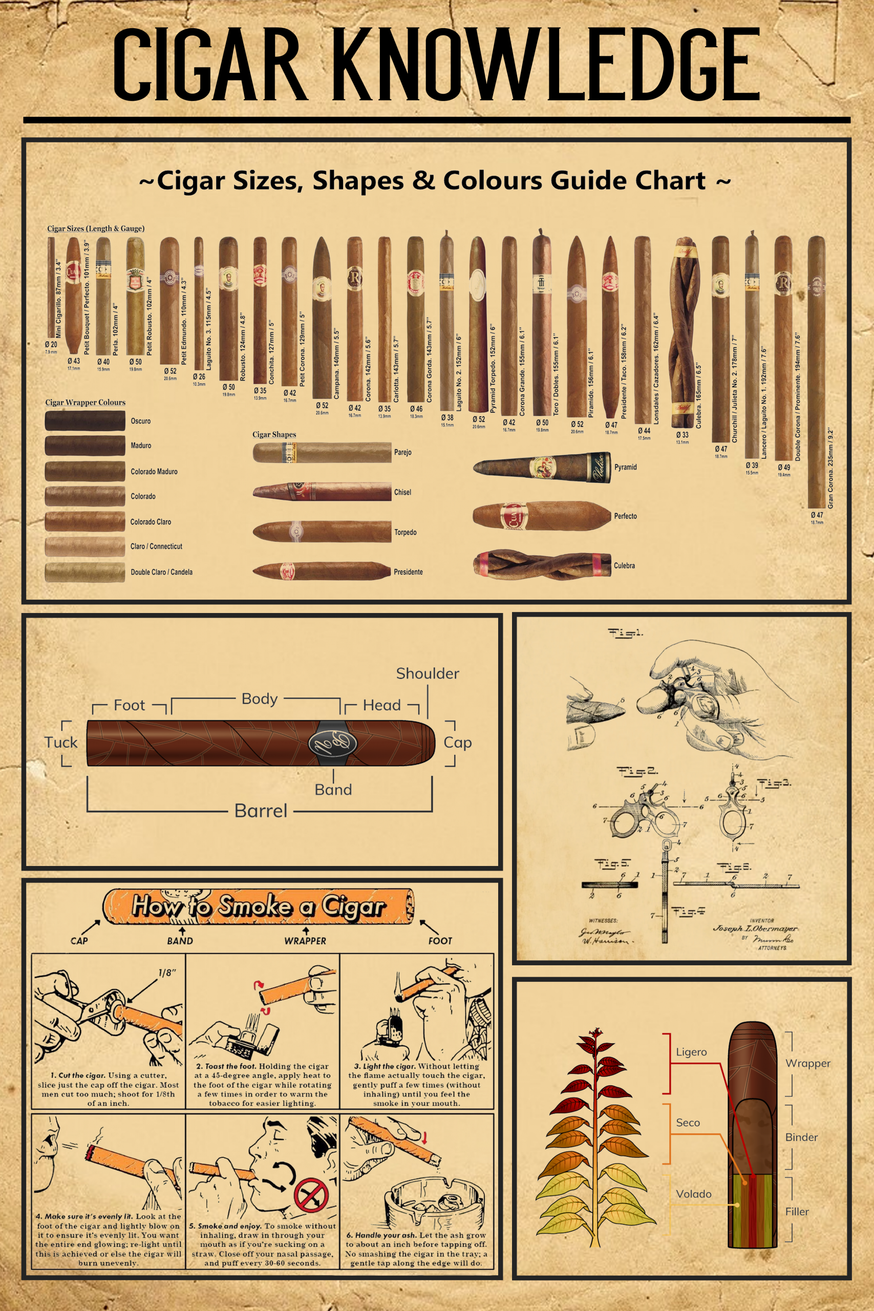 Cigar Knowledge Poster Cigar Sizes Shapes Colours Guide Chart Anatomy Infographic Wall Art