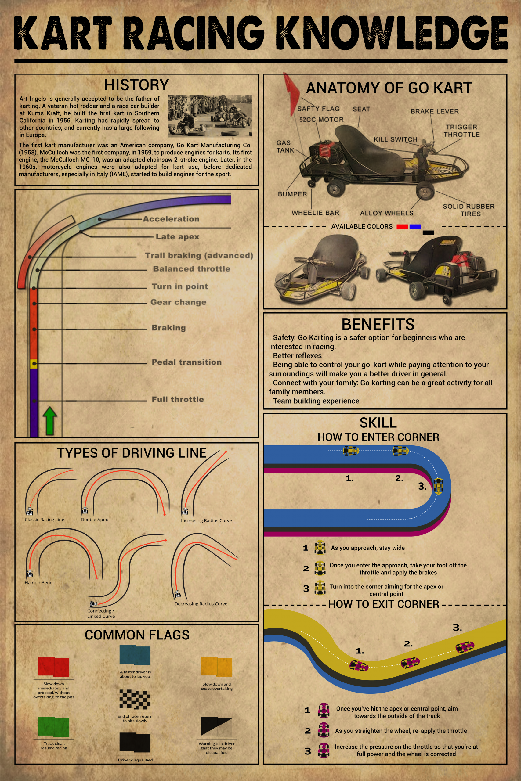 Kart Racing Knowledge Poster Go Kart Anatomy Driving Lines Cornering Flags History Guide Wall Art