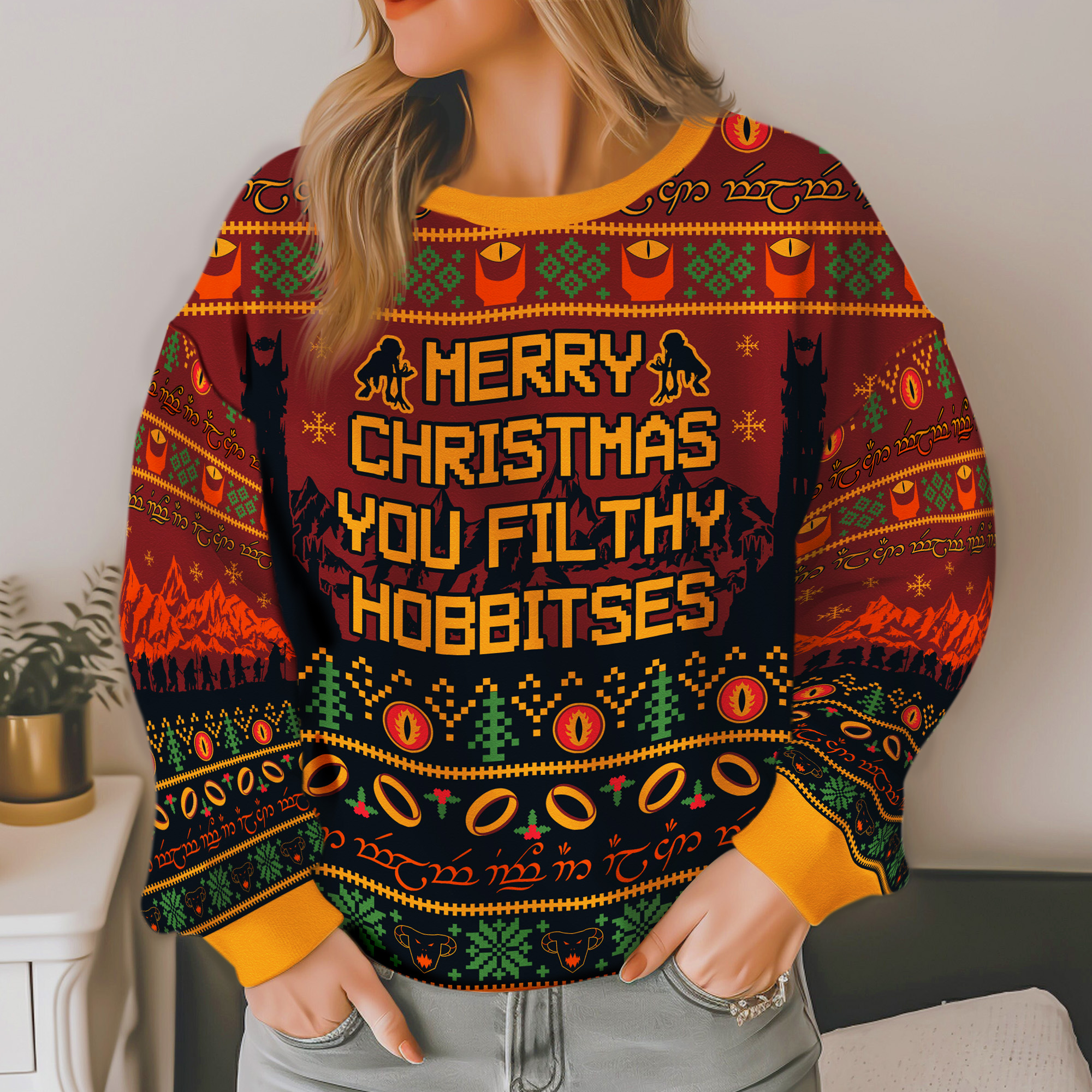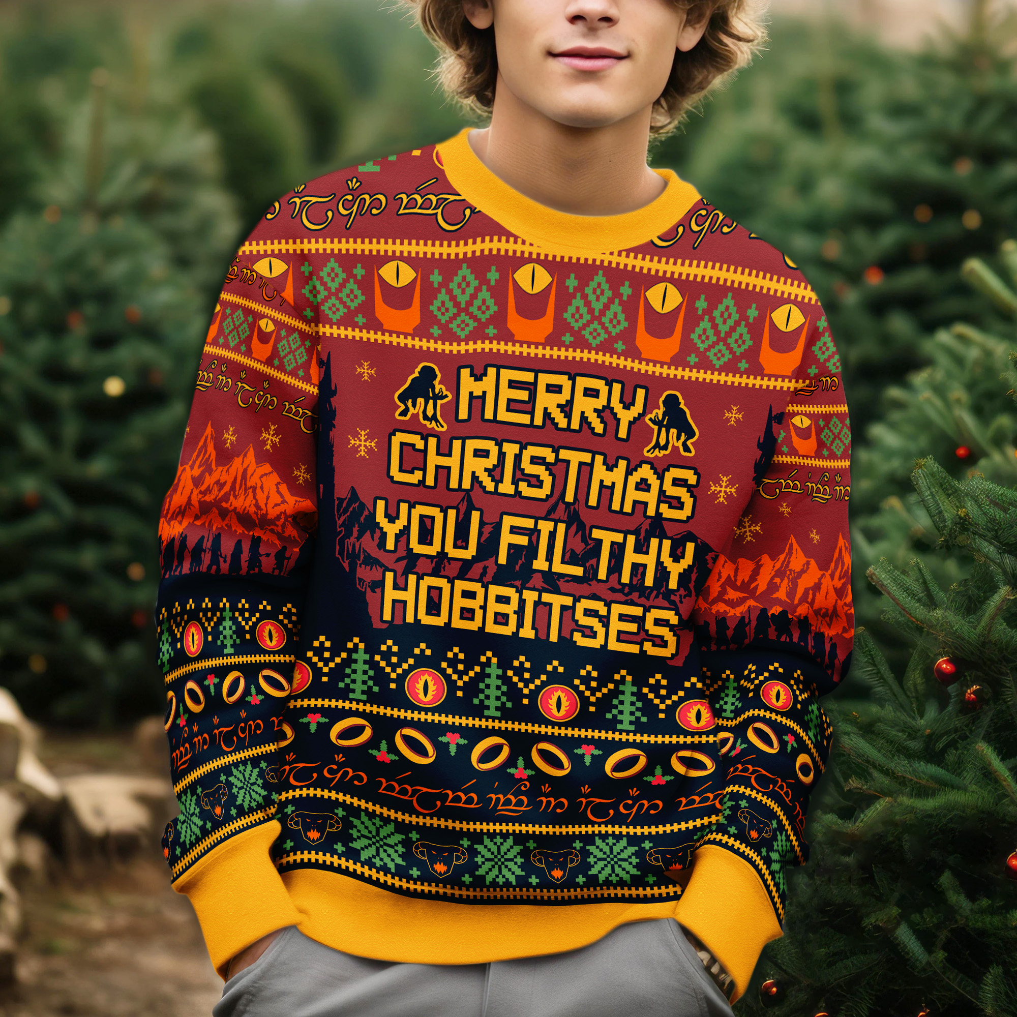 Lord of the Rings Merry Christmas You Filthy Hobbitses Sauron Eye & One Ring Pattern Ugly Xmas Sweater