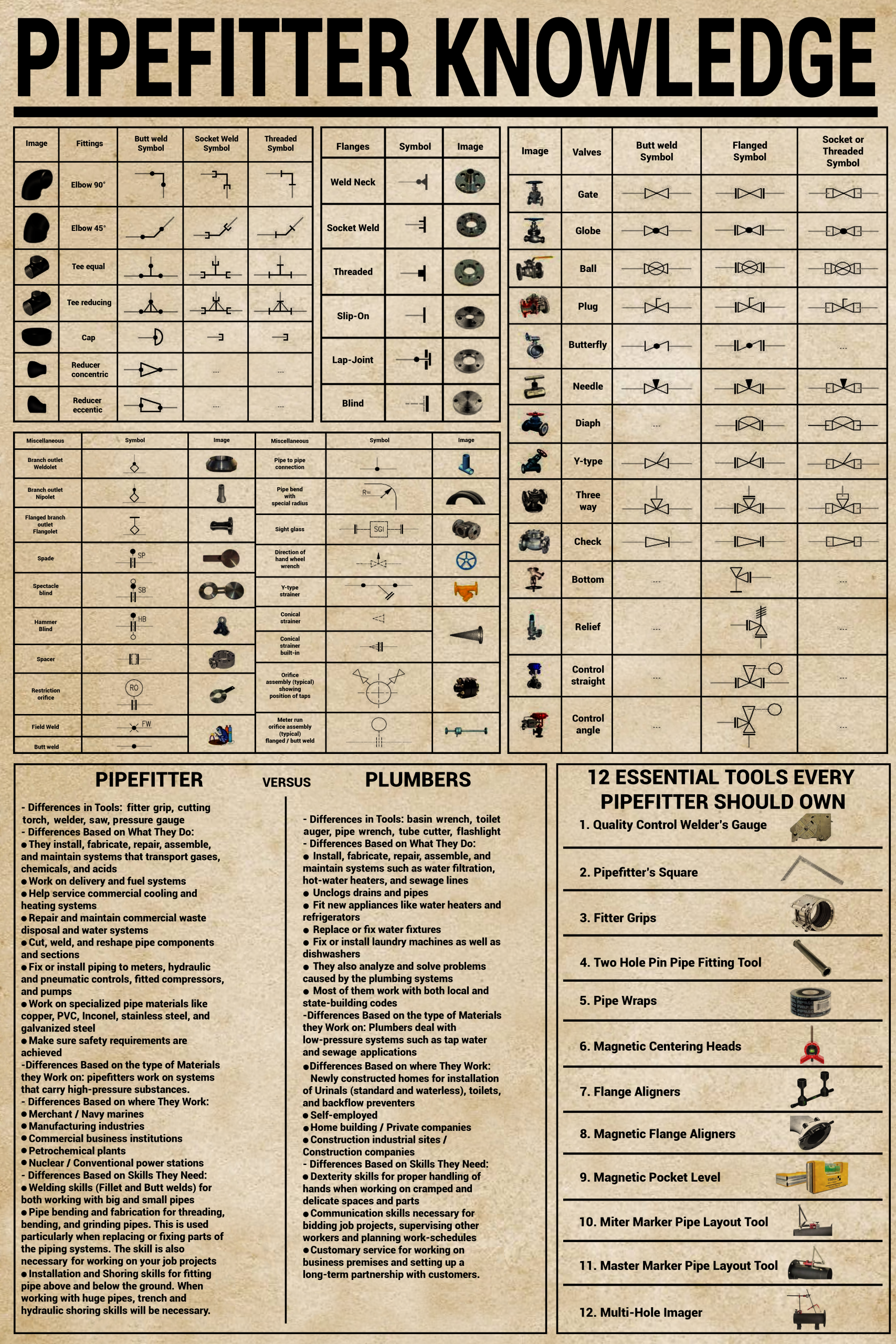 Pipefitter Knowledge Poster Pipe Fittings Flanges Valves Symbols Tools Comparison Guide Wall Art